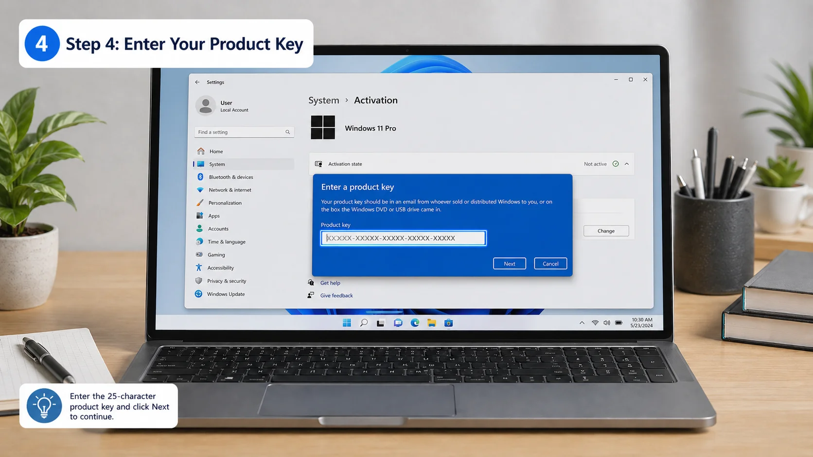 Enter the Windows 11 Pro product key carefully. A Windows product key is usually a 25-character code. Microsoft confirms that Windows may require either a 25-character product key or a digital license depending on how the copy was obtained.